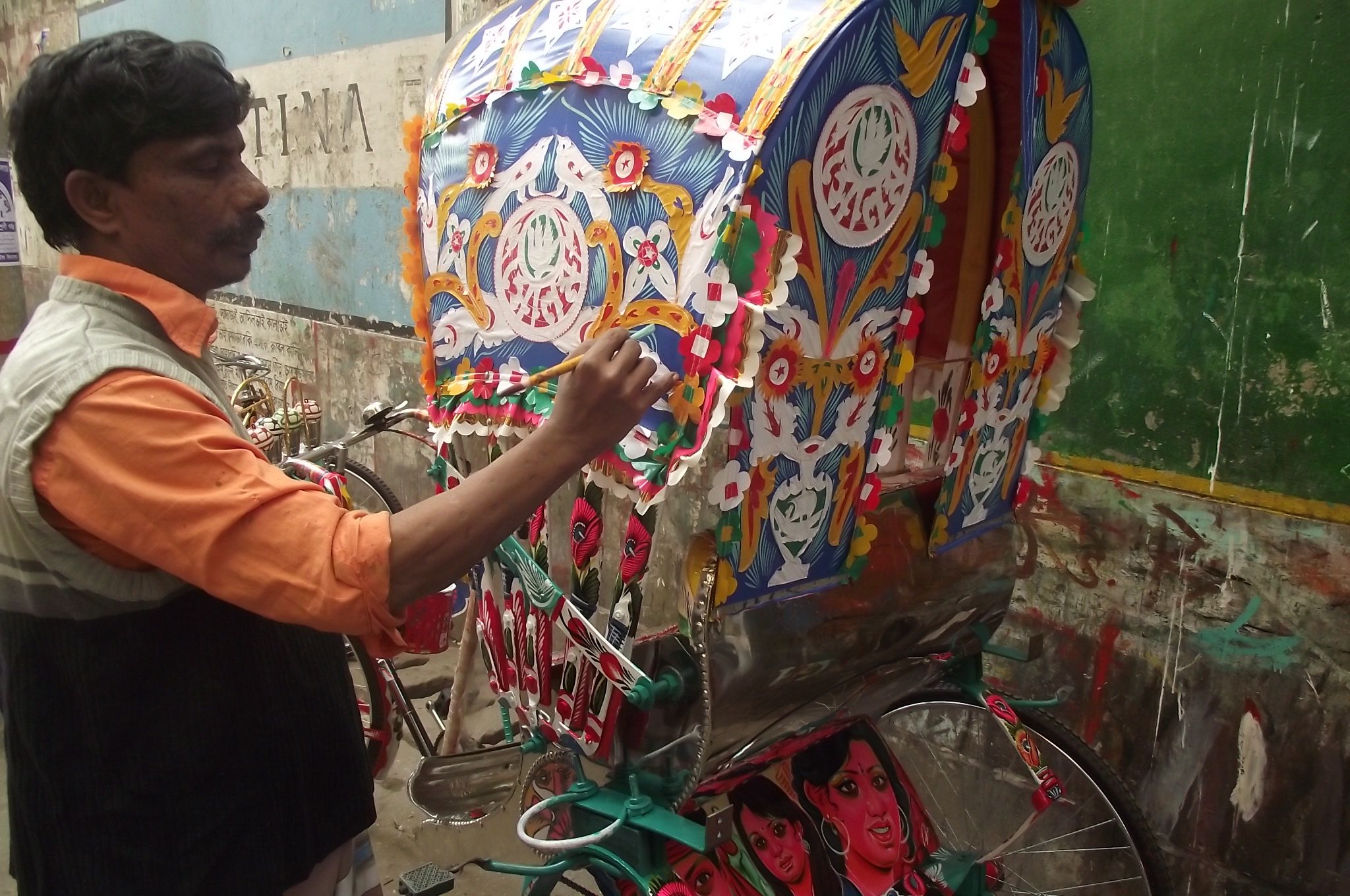 The owner has some influence over what designs feature on their rickshaw but usually they agree a price with the artist who will be painting it, who then has the freedom to paint it as they wish. The decoration of the rickshaw accounts for around a quarter of the total cost of buying one. Artists normally sign or mark the work so it’s possibly to identify who has painted it. There aren’t too many rules surrounding rickshaw art copyright and artists are commonly inspired by each other.